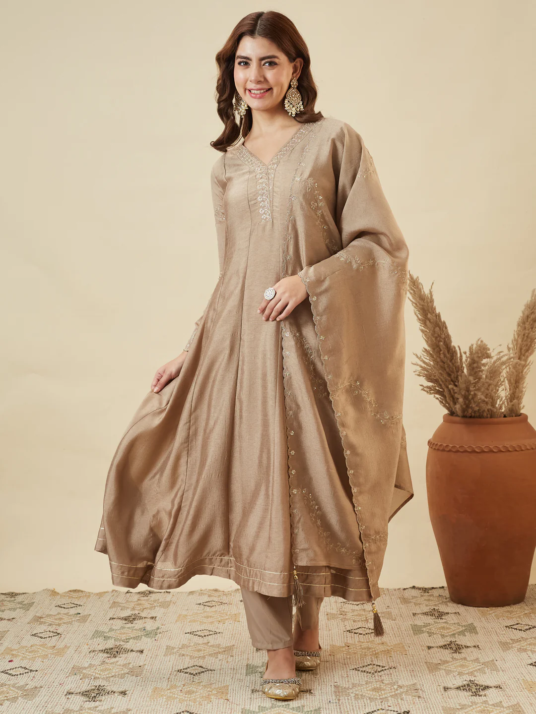 Beige Silk Embroidered Anarkali Kurta with Dupatta Set