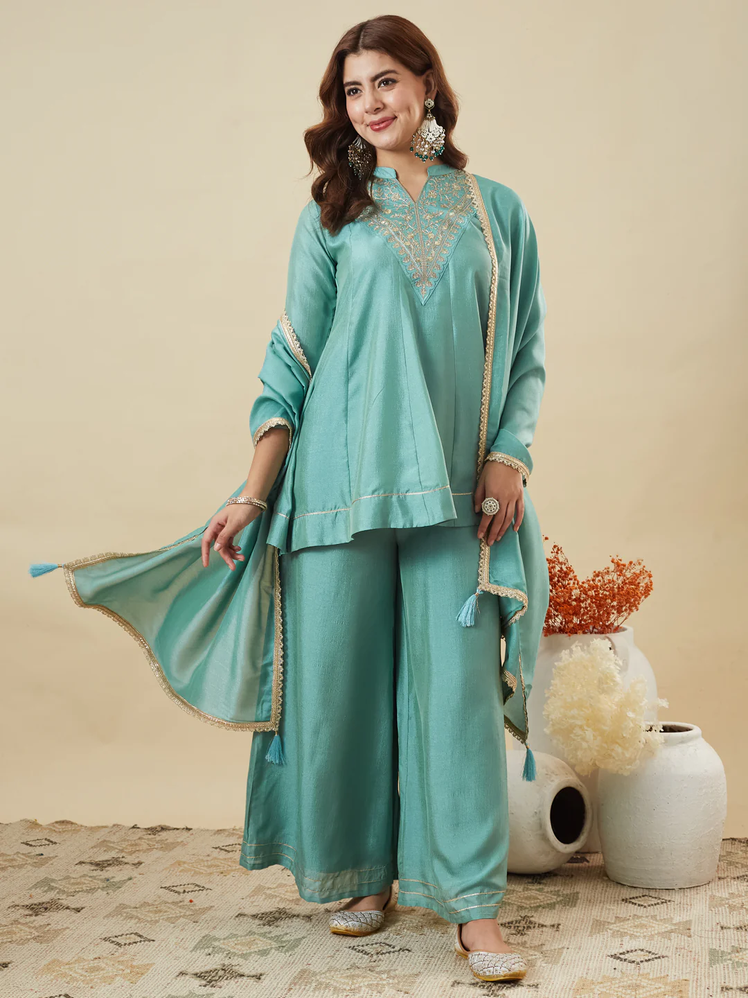 Elevate your festive look with this Premium C-Green Silk Embroidered Kurta Sharara Suit with Dupatta. Crafted in rich silk fabric, the kurta features intricate thread embroidery that adds a touch of elegance. The matching sharara offers a graceful flare, ensuring comfort with style. Paired with a beautifully bordered dupatta, this ensemble is perfect for weddings, festivals, and special celebrations. A timeless outfit designed to make you stand out effortlessly.