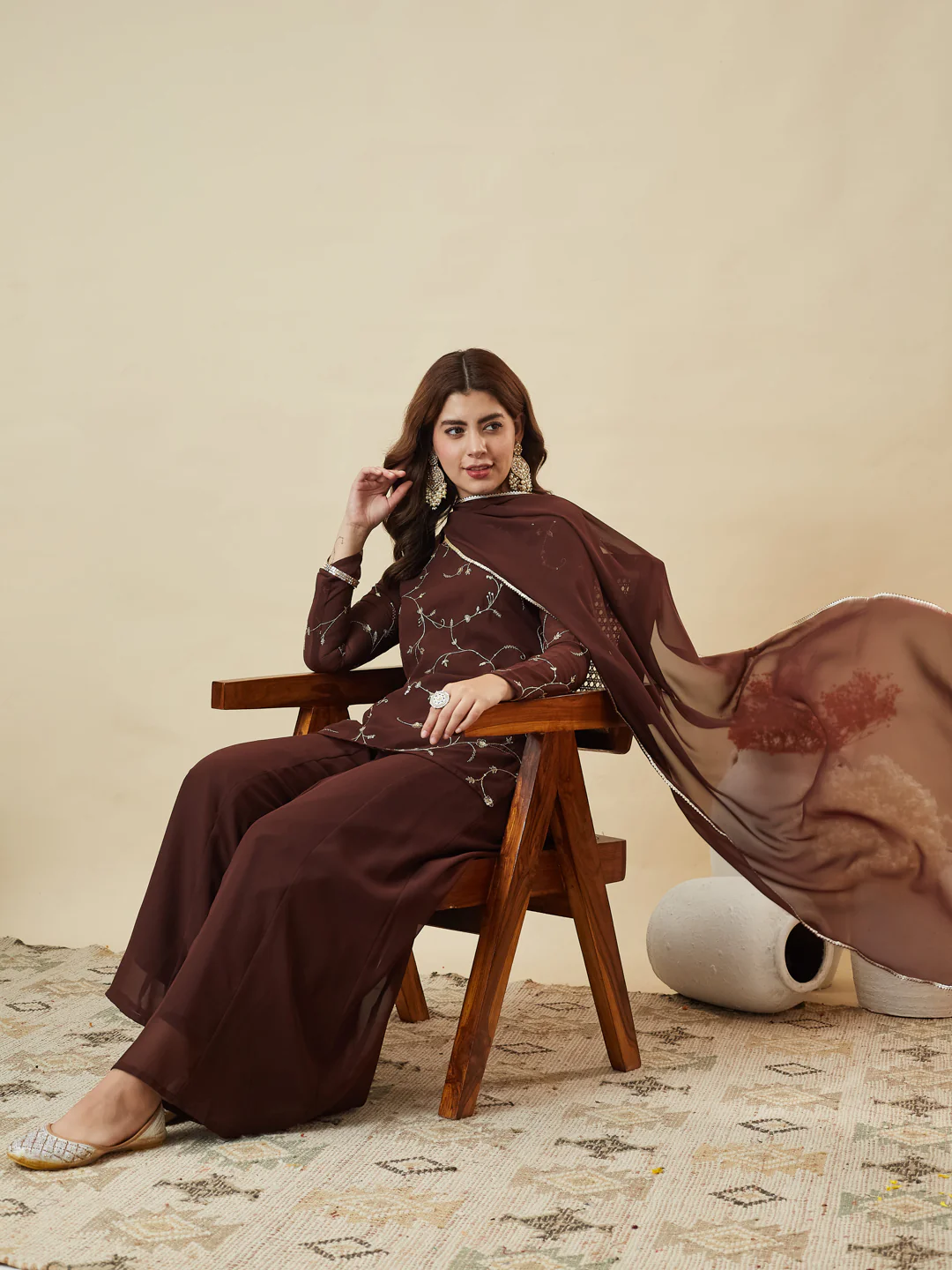 Coffee Embroidered Georgette Straight Suit Set With Dupatta