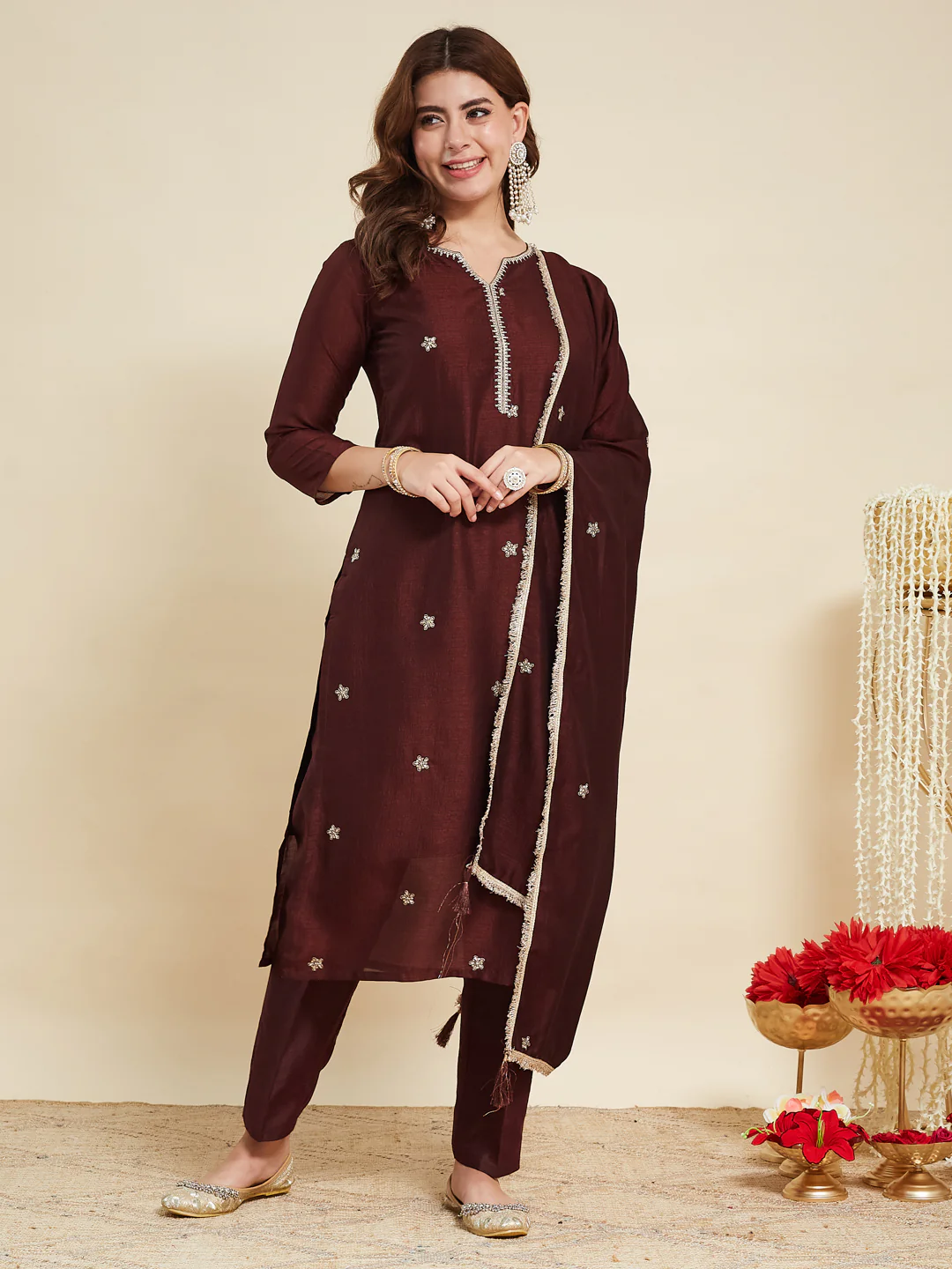 Coffee Embroidered Silk Kurta with Dupatta Set