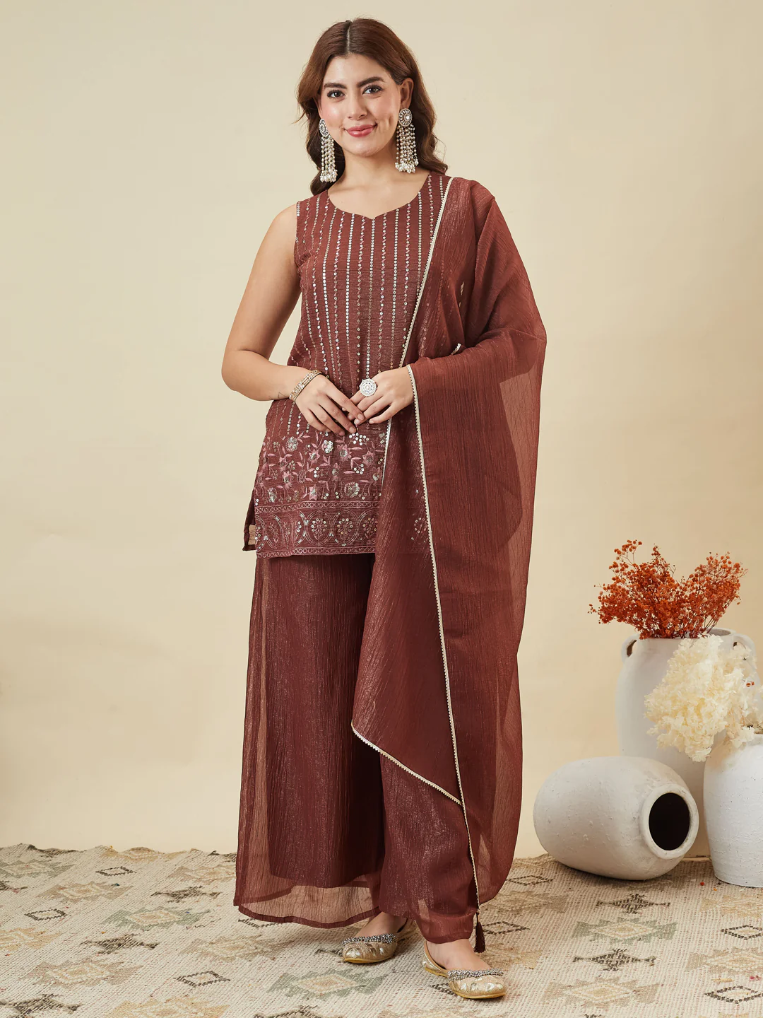 The Coffee Silk Embroidered Palazzo Suit with Dupatta blends luxury and tradition in a premium silk finish with delicate hand embroidery and subtle sequin detailing. The soft beige tone adds timeless elegance, while the flowy palazzo ensures comfort and effortless movement. Paired with a lightweight matching dupatta, this outfit is perfect for weddings, receptions, festive celebrations, and traditional events