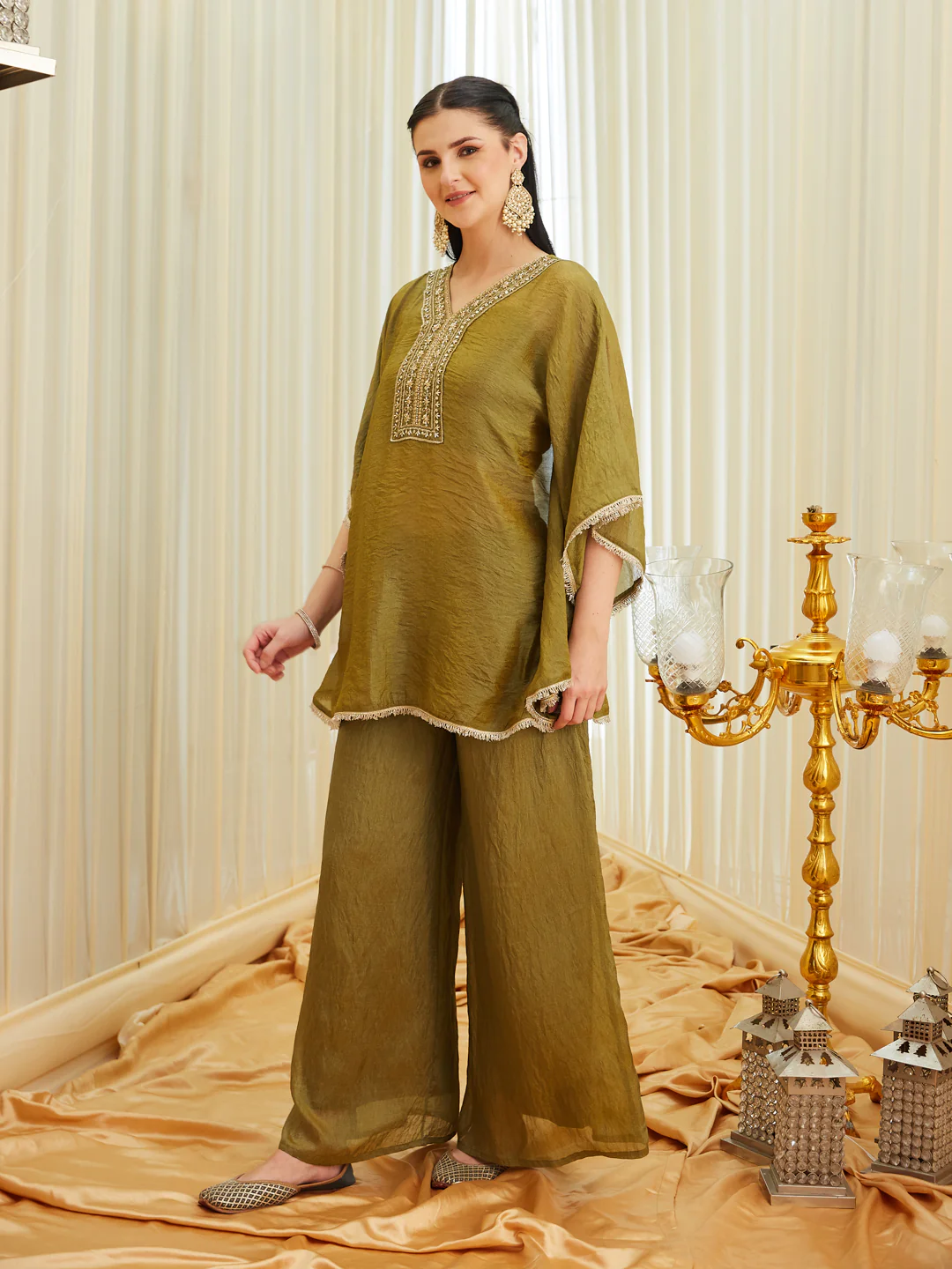 Green Silk Embroidered Kaftan Palazzo Set for Women