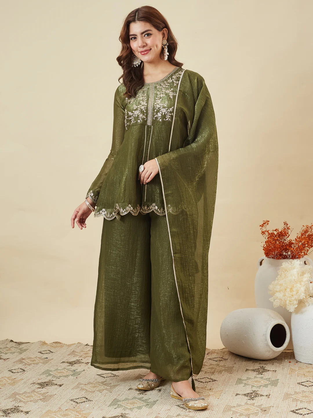 Green Silk Top Sharara Set features rich embroidery on the yoke and sleeves, crafted in premium silk fabric for a luxurious festive look. The flared sharara paired with a beautifully detailed kurta gives a graceful silhouette. The matching dupatta with contrast edging completes the elegant ensemble, making it perfect for festive celebrations, parties, weddings, and special occasions