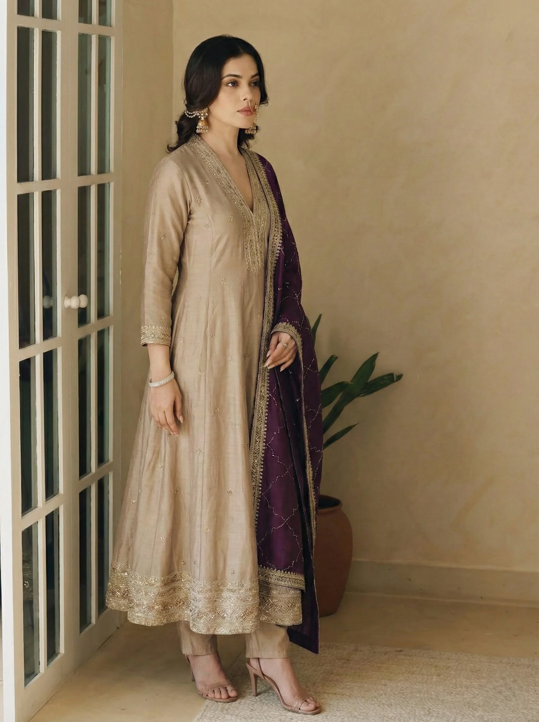 The Grey Embroidered Silk Anarkali Kurta With Purple Dupatta Set is a graceful and elegant ensemble crafted from rich silk fabric. Featuring intricate embroidery and a flowy Anarkali silhouette, it exudes timeless charm. Paired with a matching dupatta, it's perfect for weddings, festive occasions, and celebrations.