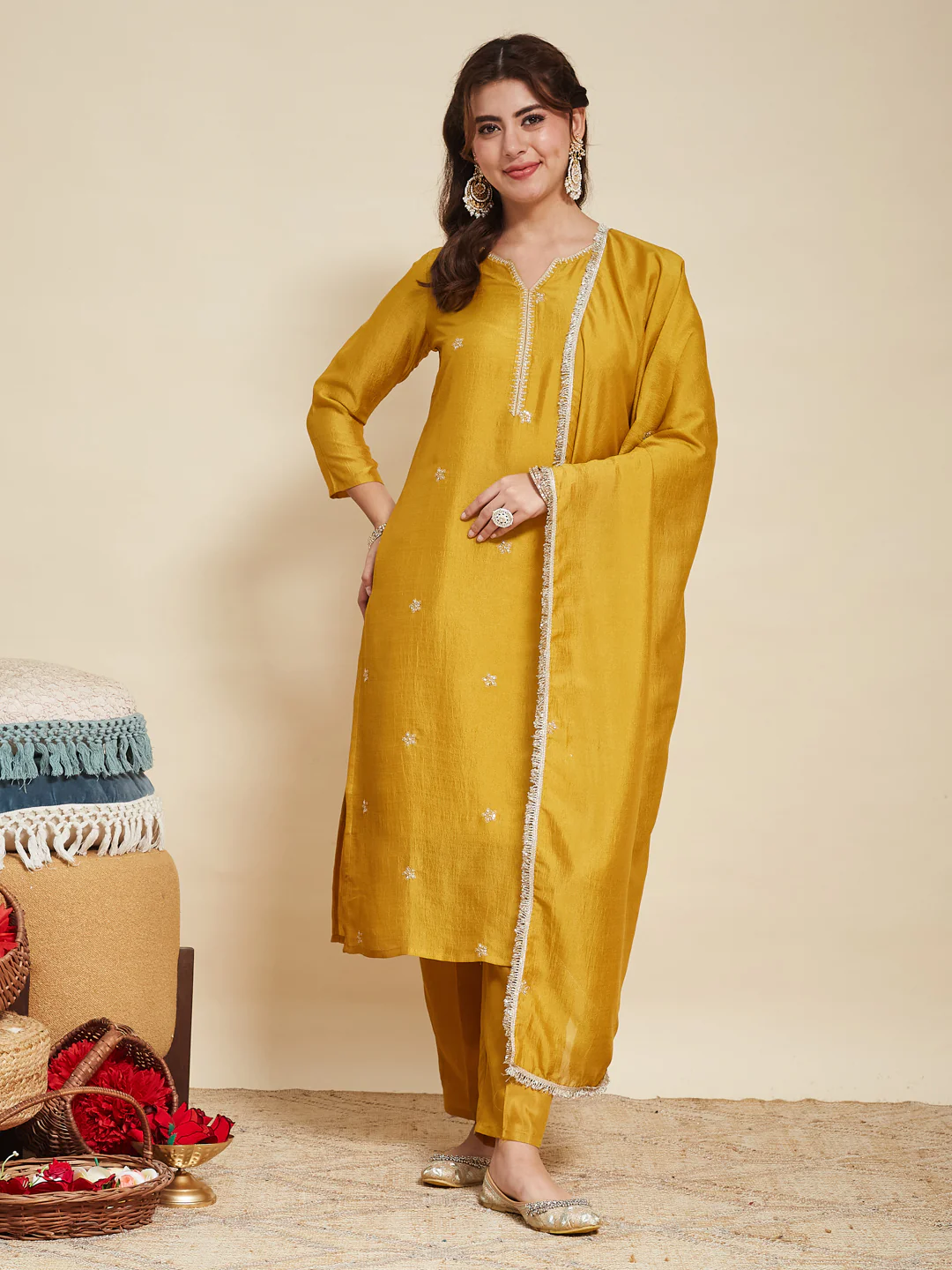 Light Mustard Embroidered Silk Kurta with Dupatta Set