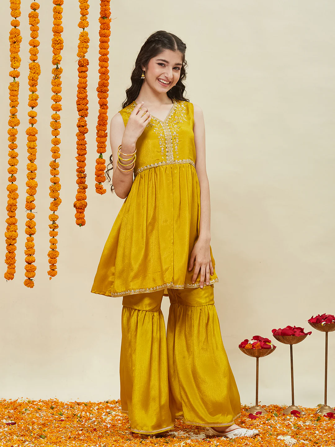 Mustard Poly Chinon Embroidered Kurta & Sharara for Girls