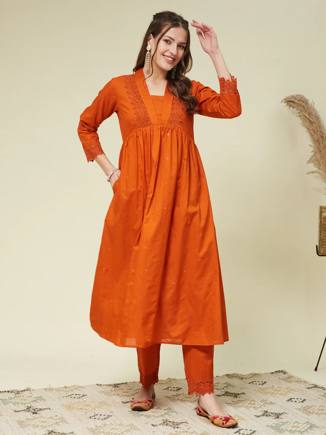 The Orange Cotton Embroidered Co-ord Set for Women blends comfort with style, featuring intricate embroidery on breathable cotton fabric. Perfect for casual outings or festive wear, its vibrant hue adds charm. Pair with statement earrings and flats for an effortlessly chic look.