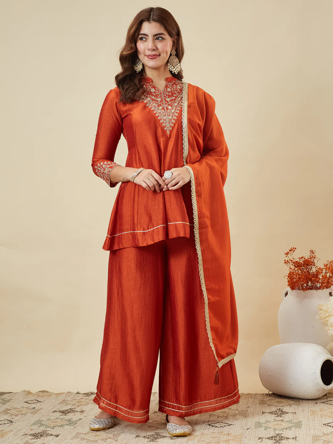 Elevate your festive look with this Premium Orange Silk Embroidered Kurta Sharara Suit with Dupatta. Crafted in rich silk fabric, the kurta features intricate thread embroidery that adds a touch of elegance. The matching sharara offers a graceful flare, ensuring comfort with style. Paired with a beautifully bordered dupatta, this ensemble is perfect for weddings, festivals, and special celebrations. A timeless outfit designed to make you stand out effortlessly.