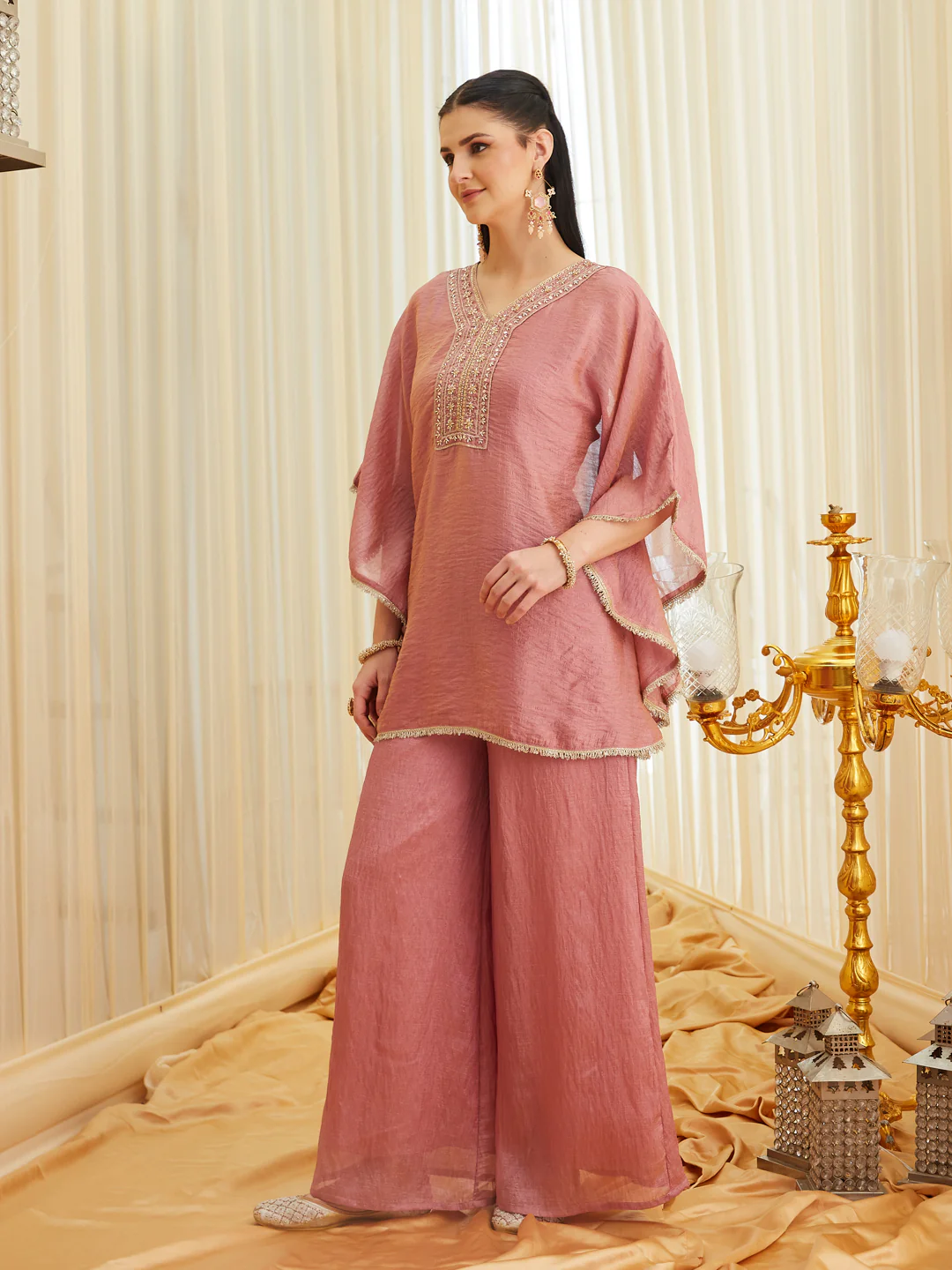 This Pink Silk Embroidered Kaftan Palazzo Set for Women is designed for effortless elegance and comfort. Crafted from soft silk fabric, the kaftan-style top features delicate embroidery along the neckline, paired with flowy palazzo pants for a graceful silhouette. Perfect for festive occasions, evening gatherings, weddings, and celebrations, this set offers a modern ethnic look with a luxurious feel.
