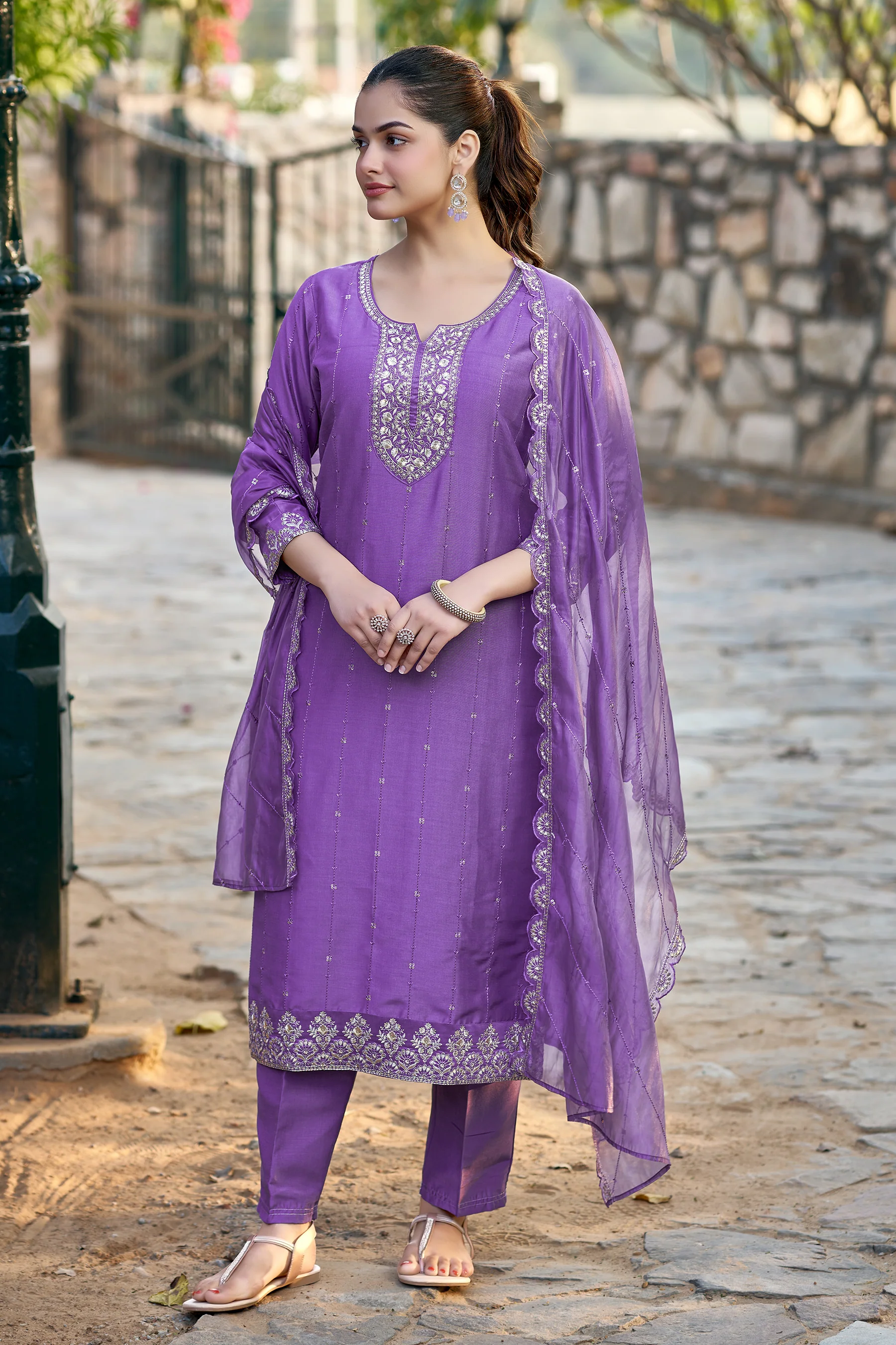 Elevate your ethnic style with this Purple Chinon Embroidered Kurta & Dupatta Set. Featuring a round neck, 3/4 sleeves, and a straight calf-length silhouette, its rich color and delicate embroidery make it perfect for festive and elegant occasions.