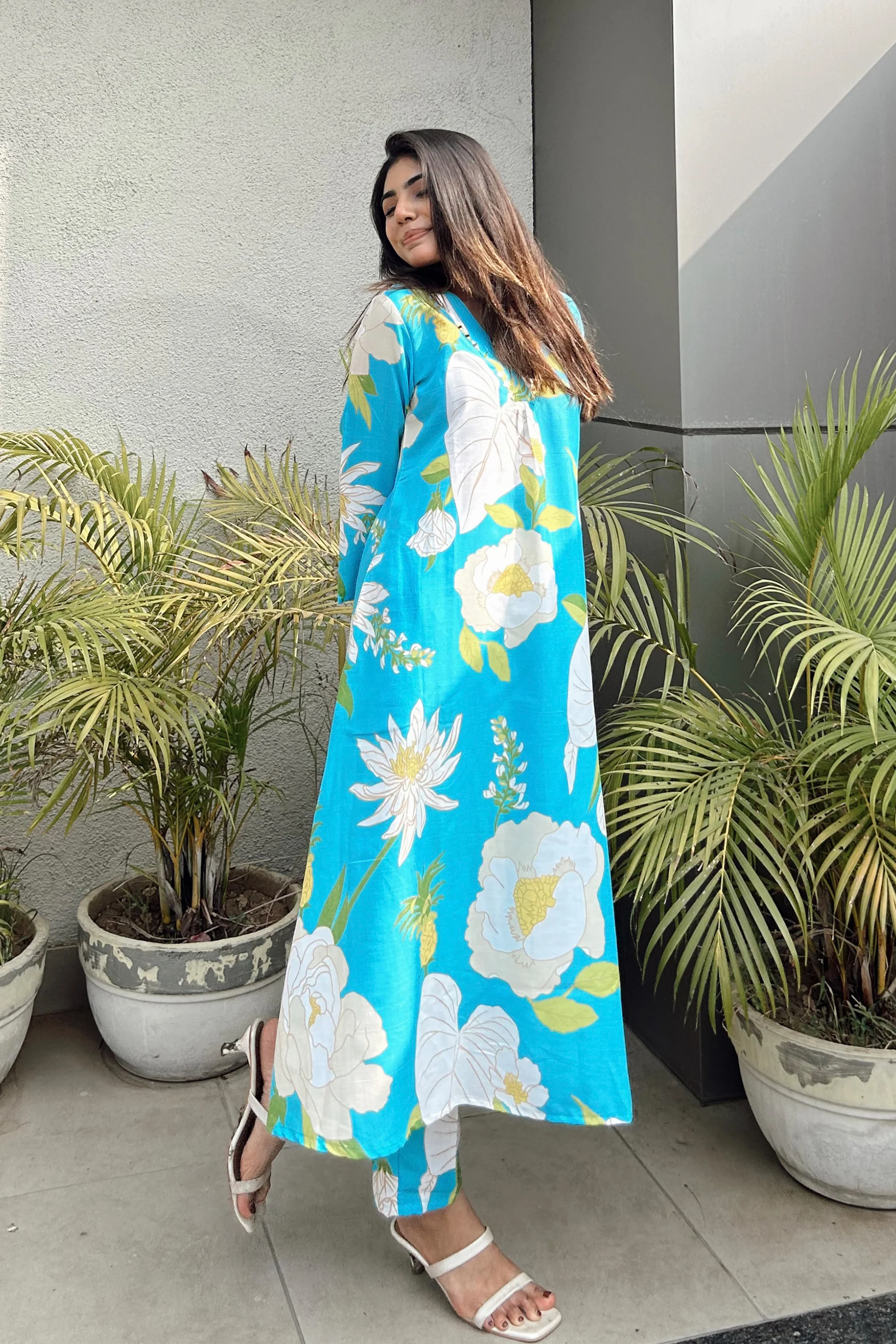 This Sky Blue Printed Embroidered Cotton Co-Ord Set features delicate embroidery over soft, breathable cotton. The subtle print adds a touch of charm, making it perfect for everyday elegance or casual outings