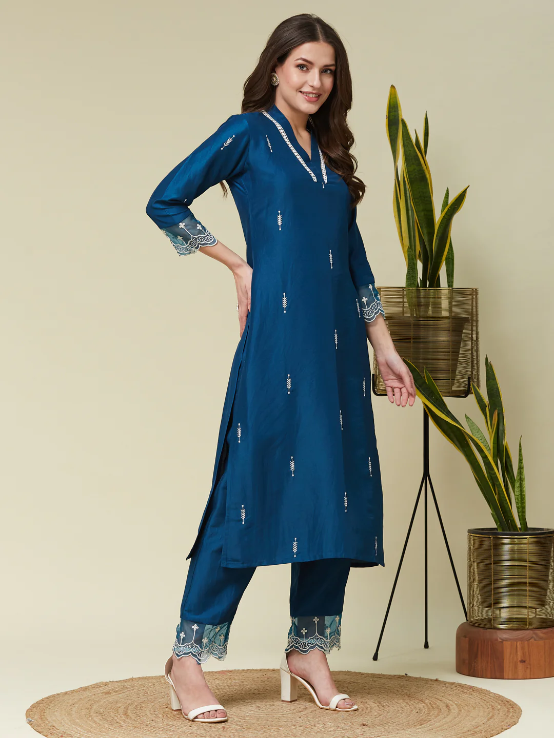 Teal Blue Chinon Embroidered Co-ord Set